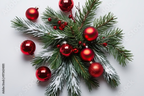Festive Snowberries with Juniper Branches and Red Ornaments on White Background