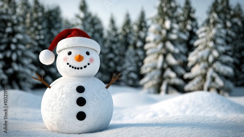Festive snowman with a Santa hat, clutching a snowball in front of a snow-covered forest, bringing winter joy, 3D illustration.