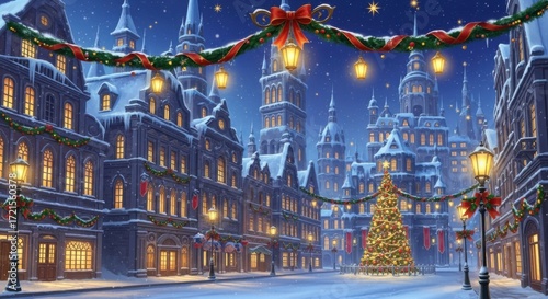 Festive Snowy City Street Scene with Christmas Tree and Warm Lights in Winter Holiday Atmosphere