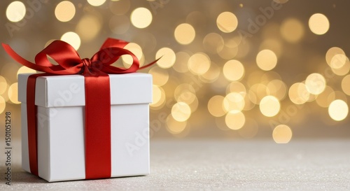 Festive White Gift Box With Red Ribbon And Bokeh Lights Background Photo