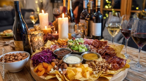 Festive wine and cheese platter with assorted snacks and candles on rustic table
