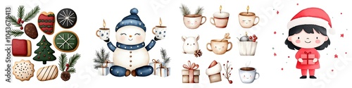Festive winter illustrations featuring a snowman, girl in red, and holiday treats on white isolated background.