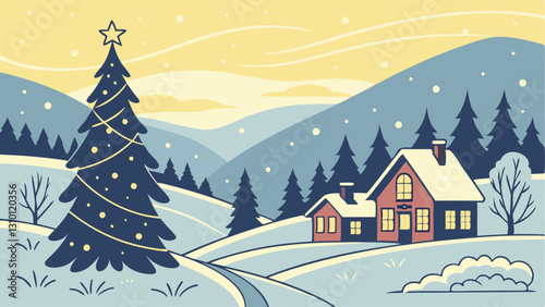 Festive winter landscape with a village in the background and festive SVG, Christmas tree in the foreground SVG. Illustration can be used as a Christmas holiday card AI, Day, EPS, PNG, JPEG File.