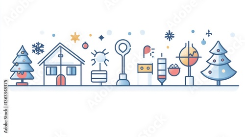 Festive winter scene house, trees, ornaments. Holiday celebration illustration