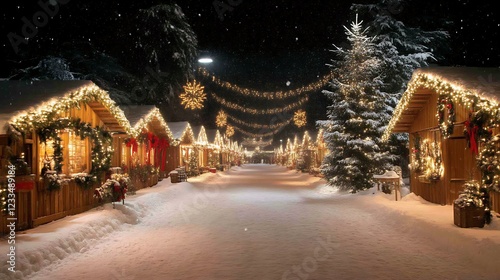 snow, winter, christmas, village, cabin, light, festive, holiday, street, night, scene, magical, charming, cosy, wooden, house, decorated, illumination, garland, tree, evergreen, snowy, ambience, atmosphere, wonderland, twinkling, bright, beautiful, serene, peaceful, romantic, celebration, joy, happiness, merry, season, december, holiday, christmas, magic, wonder