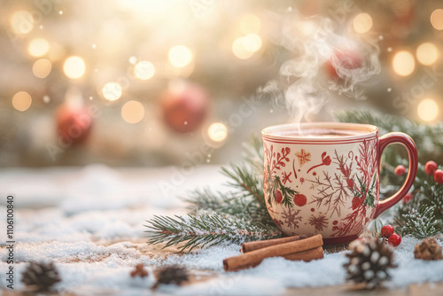 Festliche Tasse Glühwein auf einem holzgedekten Tisch, umgeben von Schnee, Zimt und Mistelzweig. Im Hintergrund leuchten Weihnachtslichter, die eine warme, gemütliche Atmosphäre schaffen