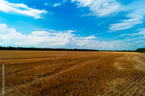 Field after harvest with traces of cars among the remaining cut wheat stalks against the blue sky with clouds.