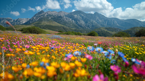 flower, field, landscape, meadow, sky, summer, spring, nature, mountain, flower, grass, yellow, mountain, green, blue, beautiful, plant, countryside