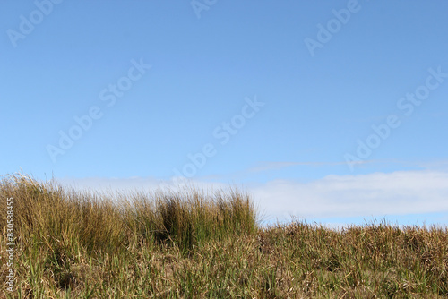 Field of grass against a blue sky background