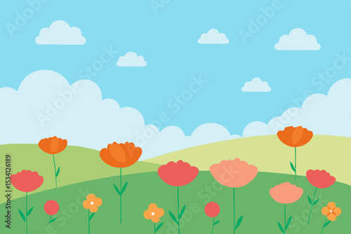 flower, summer, nature, grass, field, spring, sky, landscape, poppy, meadow, flower, vector, garden, sun, illustration, floral, butterfly, cartoon, cloud, plant, design, season, blossom, red, beauty