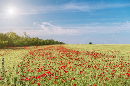 field, red, poppy, nature, flower, green, summer, meadow, sky, landscape, blossom, background, beautiful, plant, beauty, bloom, spring, blue, colours, grass, rural, garden, wild, floral, natural, bud, season, agriculture, countryside, grow, flora, cloud, idylli, stem, sun, herbal, leaf, wildflower, scarlet, farm, sunny, herb
