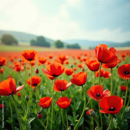 Field of red poppies with a subtle gradient effect, blossom, nature, landscape