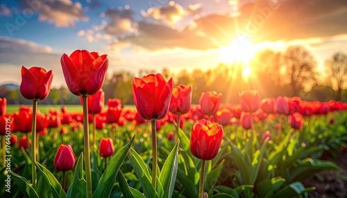 tulip, red, flower, field, nature, spring, sunrise, sunburst, golden hour, dew drops, water, wet, green, leaf, plant, floral, blooming, garden, meadow, landscape, outdoors, scenic, beauty, vibrant, colours, light, sunshine, dawn, morning, bright, fresh, growth, botanical, season, agriculture, rural, park, flora, natural, organic