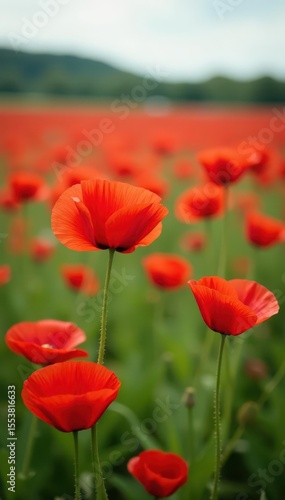 Field of vibrant red poppies swaying gently in the breeze, wildflowers, field, landscape