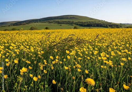 Field of yellow buttercups blooming under a clear blue sky on a sunny day