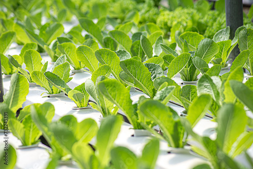 Field vegetable lettuce fresh organic farm. Close up hydroponic vegetable plantation green salad cultivate farm. Green oak lettuce salad in green Farm. Salad farm vegetable green oak lettuce field