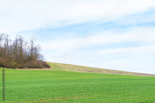 Field with young crops, landscape agricultural background