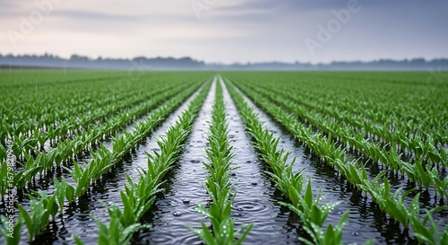 Fields of Promise: Symmetrical rows of young, vibrant crops stretch towards the horizon, conveying the promise of a bountiful harvest in this striking landscape.