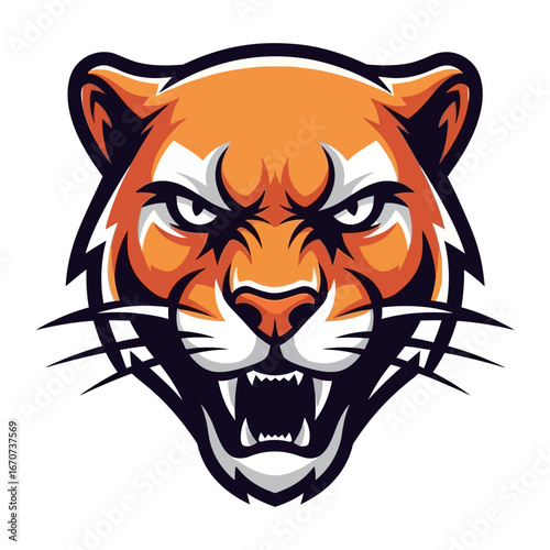 cougar, animal head, mascot, predator, wildlife, big cat, felino, ferocious, sports team, logotype, illustration, head, animal, cat, fierce, strong, determined, design, graphic, artwork, emblem, symbol, powerful, aggressive, wild, roaring, teeth, eye, ear, fur, orange, sharp, bold, dynamic, team, motivation, inspirational, wild animal, strength, hunting, danger, confident, courage, energy, roar