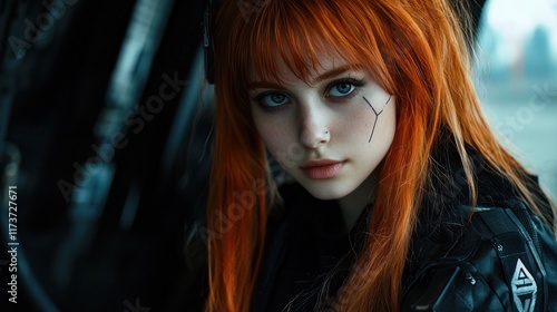 woman, girl, portrait, fashion, red, hair, orange, model, make-up, style, photo, beauty, eye, face, look, intense, serious, expression, futuristic, clothing, costume, cosplay, attractive, gorgeous, seductive, mysterious, enigmatic, dark, rebellious, strong, powerful, confident, fierce, head shot, closeup, artistic, stylish