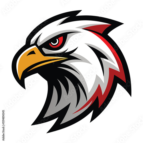 eagle, bird, head, animal, mascot, logotype, art, predator, wild, wildlife, avian, red, black, grey, fierce, strong, power, strength, profile, beak, eye, sharp, hunter, symbol, emblem