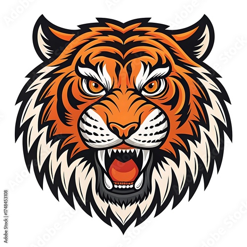 tiger, head, wildlife, animal, predator, big, cat, roar, fierce, powerful, menacing, aggressive, stylised, graphic, art, design, orange, black, white, stripes, mane, claw, teeth, nature, strength, majestic