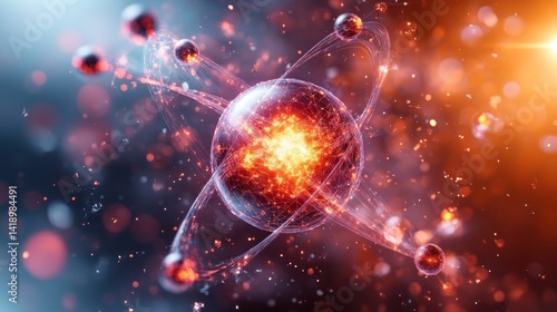 atom, nucleus, electron, energy, science, physics, quantum, particle, three-dimensional, render, glowing, orbit, plasma, fire, heat, explosion, cosmic, abstract, digital, art, technology, innovation, molecular, structure, model, graphic, design, illustration, vibrant, intense, light, bright, colours, red, orange, blue, spark, complex, phenomena
