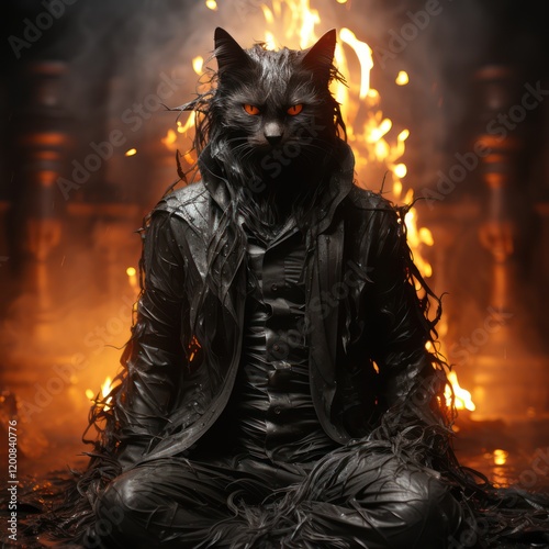 Fiery Black Cat with Piercing Eyes in a Mystical Flame Design By Generated AI