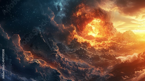 fire, sky, night, cloud, mountain, star, celestial, landscape, dramatic, orange, yellow, red, blue, dark, bright, light, abstract, fantasy, art, digital, painting, space, cosmic, astronomy, universe, galaxy, nebula, energy, power, nature, wild, intense, beautiful, dreamy, surreal, epic, powerful, wonder