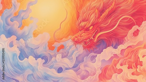Fiery dragon emerging from vibrant clouds. A powerful image of mythical creature in warm sunset hues.