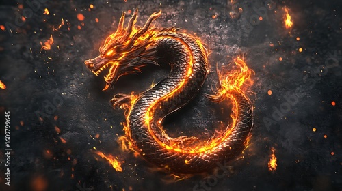 Fiery dragon photo on dark textured background symbolizing power and chinese mythology