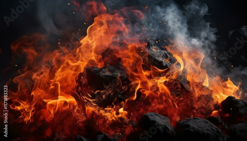 fire, flames, ember, rock, smoke, heat, intense, orange, red, dark, texture, power, energy, dramatic, burning