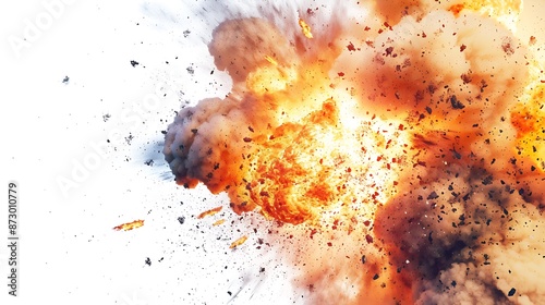 explosion, fire, smoke, debris, blast, flames, burning, impact, fireball, destruction, chaos, danger, power, energy, heat, force, dust, particle, white, background, isolated, photo, photo, image, visual, graphic, art, design, abstract, motion, dynamic, intense, bright, orange, brown, grey, red, yellow