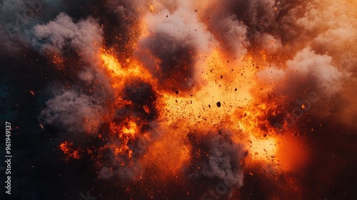 Fiery explosion with bright orange flames and thick smoke spreading outward, a dynamic moment of destruction and chaos