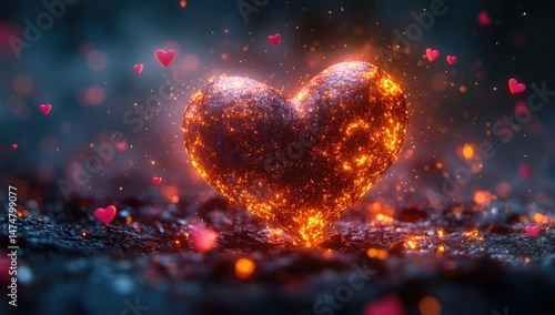 Fiery heart, glowing embers, dark background, Valentine's Day