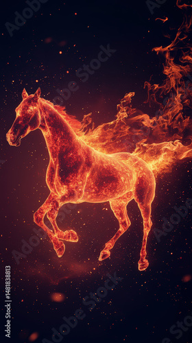 horse, fire, flames, ember, burning, fiery, mythical, fantasy, creature, energy, power, magic, dark, background, abstract, digital, art, illustration, concept, movement, dynamic, red, orange, hot, celestial, star, spark, glowing, silhouette, galloping, speed, majestic, myth, legend, symbolic, high-coloured, intense, warm, spectacular, dramatic, artwork, render, element, inferno, creativity