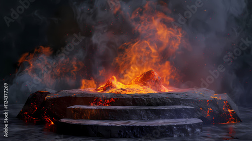 Fiery Inferno: A fiery inferno erupts from a stone platform, creating a dramatic and captivating scene. The flames are intense and bright, with billowing smoke rising into the air.