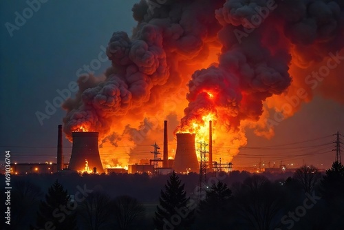 Fiery inferno engulfs industrial power plant, billowing smoke and flames against a dark sky Emergency crews battle the blaze Significant damage is evident , building fire, fire