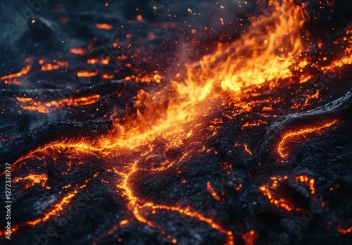 Fiery Lava Flowing Over Black Volcanic Rocks with Sparks in Dramatic Eruption Scene Capturing Raw Power of Nature's Forces and Geothermal Activity