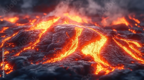 Fiery lava podium display amidst smoldering volcanic rocks. A dynamic product showcase with glowing magma and smoke in a surreal, molten landscape.