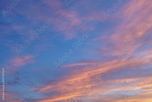 Fiery light orange hues with traces of pink and purple decorate streaky clouds drifting through a transitioning blue sky at dusk, and cover a crescent moon in a thin pink veil.