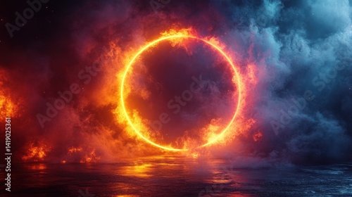 fire, ring, circle, smoke, cloud, flames, night, surreal, fantasy, portal, inferno, heaven, hell, mysterious, enigma, cosmic, dark, light, energy, power, abstract, art, digital, illustration, design, glowing, bright, intense, hot, cold, contrast, atmosphere, dramatic, scene, landscape, water, sky, space