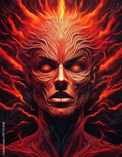 Fiery Red Human Figure with Intense Facial Expression Surrounded by Dark Jagged Lines – Representing Anger and Chaos