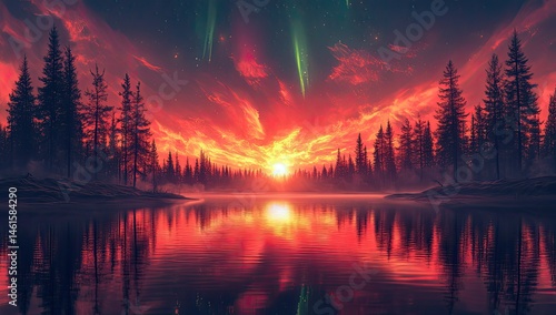 sunset, sunrise, lake, forest, tree, aurora, aurora borealis, boreal, landscape, nature, scenery, sky, cloud, water, calm, peaceful, tranquil, serene, evening, dawn, dusk, magical, mystical, fantasy, vibrant, colourful, red, orange, green, night, star, wilderness, wood, coniferous, pine, tranquil scene, background, wallpaper, postcard, artwork, digital artwork, illustration, aurora borealis