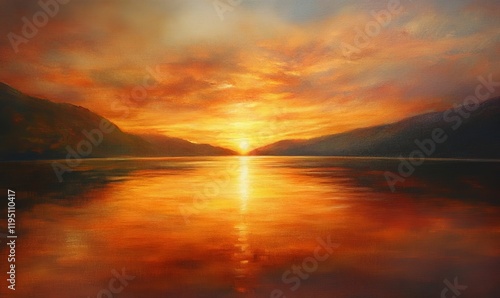 sunset, landscape, fiery, sky, cloud, water, mountain, calm, serene, gold, orange, red, hue, calmness, peaceful, evening, dusk, horizon, nature, scenic, picturesque, vibrant, warm, colours, light, glow, beauty, art, artwork