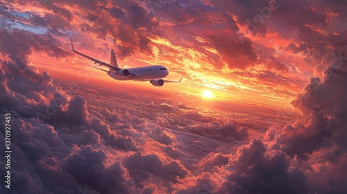 Fiery sunset paints the sky as a white airplane soars, wings spread wide. A breathtaking, vibrant digital painting