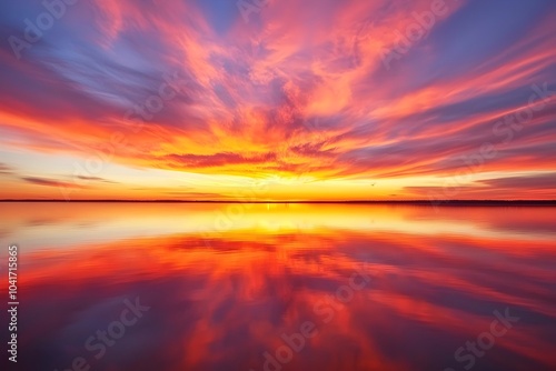 Fiery Sunset Reflection Over Tranquil Lake with Vibrant Orange and Pink Hues