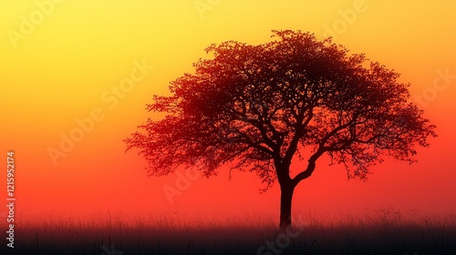 tree, sunset, silhouette, sky, nature, landscape, field, horizon, red, orange, yellow, warm, colours, dawn, evening, solitary, alone, peaceful, serene, tranquil, calm, stillness, beauty, scenic, vibrant, dramatic, fire, flames, light, shadow, dark, grass, plant, flora, tree branch, leaf, outdoors, rural, image, photo