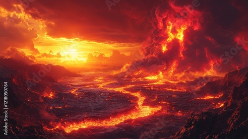 Fiery volcanic landscape at sunset, lava flows across a fiery terrain.