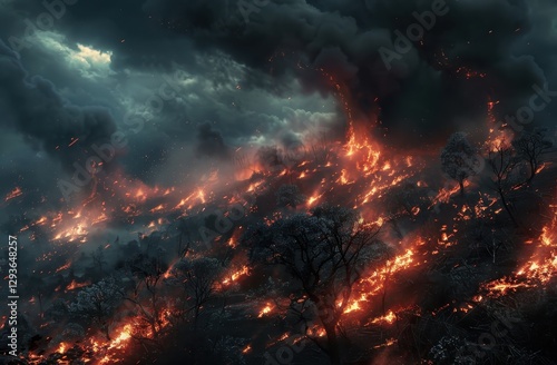 wildfire, fire, forest, burning, tree, smoke, flames, night, dark, dramatic, destruction, disaster, emergency, environmental, climate, change, global, warming, heat, danger, hazard, risk, intense, apocalyptic, inferno, blaze, conflagration, landscape, nature, environment, chaos, damage, loss, devastation, hot, scarey, ominous, threatening, powerful, fiery, dangerous, hazardous, severe, catastrophic, crisis, response, weather, natural, aerial